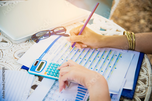 Top view of young working woman using laptop and reading annual