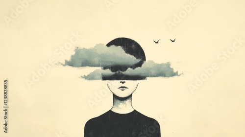 Clouds conceal person's face, serene background, birds fly; mental health concept