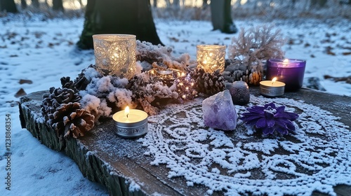 a serene winter solstice altar display with silver and purple offerings, crystals, and candles on weathered oak surface, mystical moonlit ambiance, ethereal frost patterns, ceremonial layout