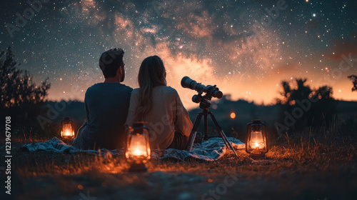 A couple stargazing on a clear night, lying on a blanket with a telescope and glowing lanterns nearby