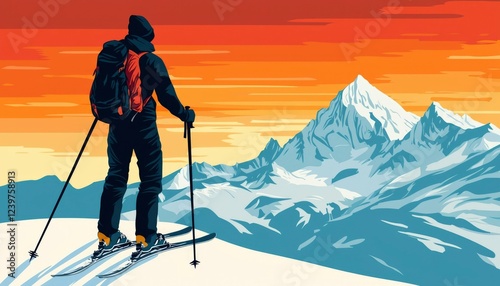Skier Contemplates Majestic Mountain Sunset Landscape