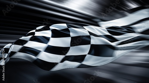 Checkered flag waves with excitement as racers approach finish line in speed. Generative AI