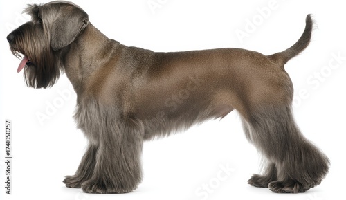 Profile view of a medium sized dog, likely a breed similar to a Wirehaired Pointing Terrier. The dog is a medium brown/grey color with a dense