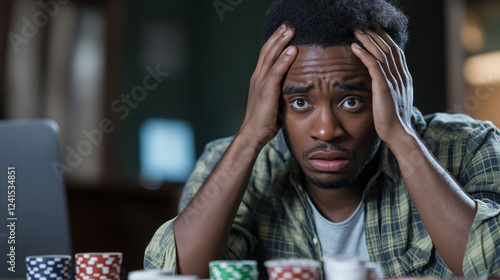 Young adult african american man is stressed and gripping head with hands after losing all money playing poker online on laptop, surrounded by empty cups with chips