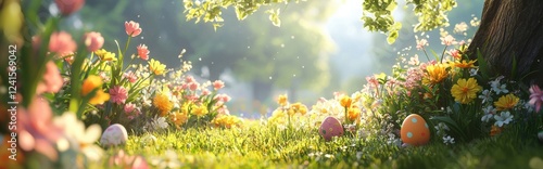 A beautiful spring meadow with hidden Easter eggs among the flowers, bright and fresh atmosphere