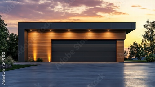 Modern Garage with Warm Lighting: A sleek, contemporary garage with wood paneling and warm lighting illuminates the exterior, creating a welcoming and inviting atmosphere.