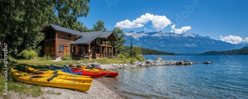 Kayaks lined up by a lakeside cabin with mountains in the background under blue sky