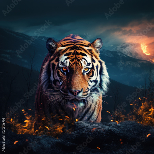Fierce Tiger Roaring Amidst Flames in a Dystopian Cityscape