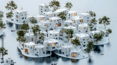 Futuristic floating micro homes arranged in an abstract yet clean and harmonious composition showcasing a visionary concept for sustainable energy efficient urban living in a contemporary