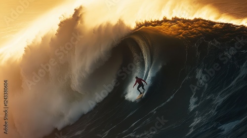 A surfer skillfully rides a massive wave in the ocean, illuminated by the vibrant colors of a stunning sunset backdrop.