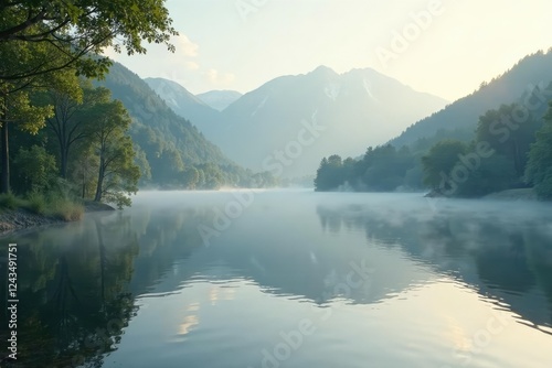 Morning mist on the surface of a calm and clear lake, peaceful, mist