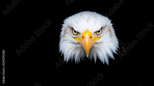 Close-up of a bald eagle staring into the camera against a dark matte background, showcasing its sharp gaze, strong beak, and detailed feathers. A symbol of strength, freedom, and national pride