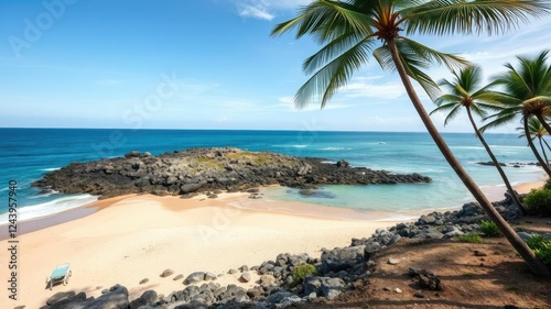 Overhead shot of a deserted tropical beach with rocky shoreline and palm trees, sandy beach, aerial view, vintage tone