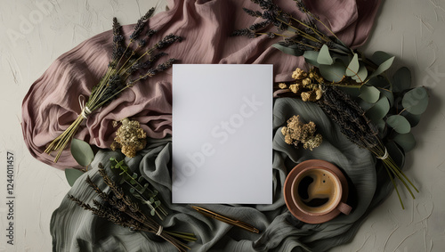 The photo is taken from a direct overhead perspective, creating a vibrant and inviting composition. A blank white sheet of paper lies at the center, resting on a textured surface draped with a softly