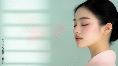 Serene Beauty: A young woman with flawless skin and dark hair, eyes gently closed, exudes tranquility in a profile shot. Her soft expression and pastel pink attire create a sense of calm and peace.