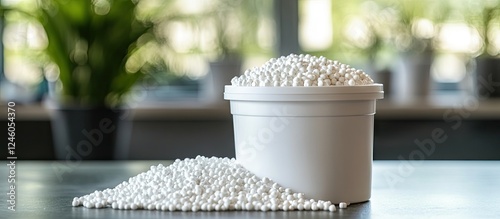 White plastic container filled with thermoplastic elastomer TPE on table showcasing white beads with green background and natural light lighting