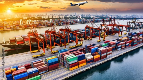 Dynamic portrayal of freight transport at a container port during sundown with a commercial aircraft flying into the horizon