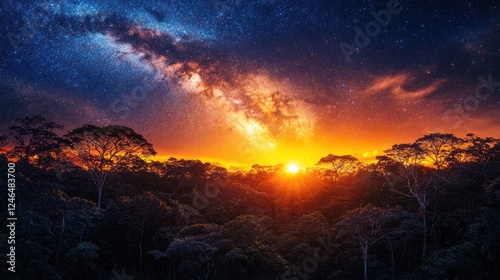 Vibrant sunset and Milky Way over rainforest.