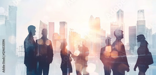 Double exposure of a diverse group of business professionals with a light blue cityscape backdrop. Abstract business concept blending urban environment with people, with soft light rays and shadow