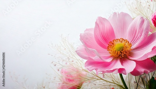 Białe, romantyczne tło z różowym kwiatem kosmosa