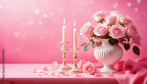 Romantyczne, różowe tło z bukietem róż w wazonie i świecami