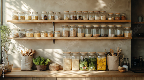 Minimalistische Vorratskammer mit Glasbehältern und natürlichen Zutaten im Sonnenlicht. Generative AI KI