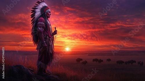 A Native American chief standing on a hill at sunset, wearing a full feather war bonnet and holding a peace pipe, gazing thoughtfully over the open plains with a herd of buffalo in the distance