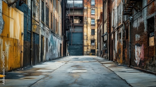 A weathered alley with old, crumbling buildings and an empty podium for displaying high-end packaging in an industrial atmosphere.