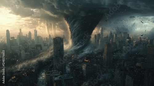 Massive Tornado Swirling Over City Skyline Under Dark Clouds