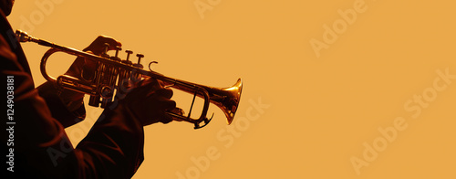 Silhouette of a musician playing a trumpet against a vibrant orange backdrop