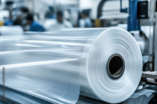 Automatic polyethylene plastic bag production machine with lighting effect. Close-up of the roller of the plastic bag production machine in the light blue scene. product packaging concept