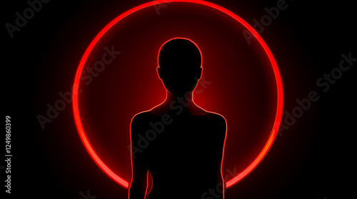 Silhouetted figure in red neon circle. Alien Rituals & Ceremonies. Illustration