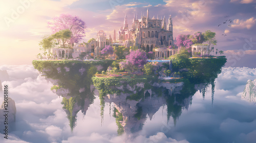 An enchanting elysian paradise: celestial gardens and floating islands in vibrant colors. elysium. illustration. Celestial Gardens. Illustration