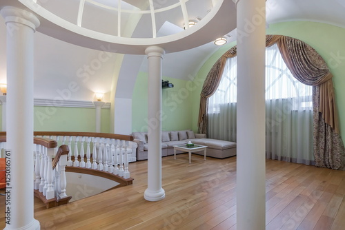 Neoclassical interior of the living room of a luxurious mansion. Rotunda in the interior. Large arched window with beautiful drapery. Furnished.