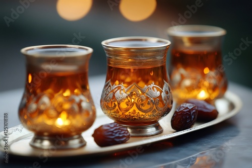 Three decorated tea glasses with dates on a metal tray during ramadan