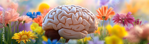 Human brain surrounded by vibrant spring flowers, representing mental health and creativity AI Generated