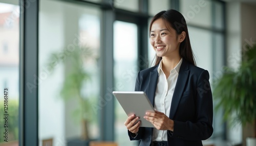 Smiling asian businesswoman stands in office holding tablet device. Female manager looks outside. Modern workspace, bright interior create positive work. Young lady in suit plans project.
