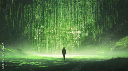 Digital rain falls upon a solitary figure in a verdant green world. Ancient Data Ruins. Illustration