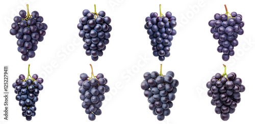 Collection of various Zinfandel grapes, dark purple and round, grown in clusters with visible stems isolated on white transparent background PNG set