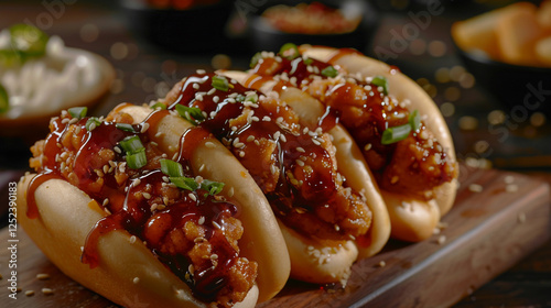 Fluffy Steamed Bao Buns with Crispy Fried Chicken, Hoisin Glaze, and Sesame Seeds
