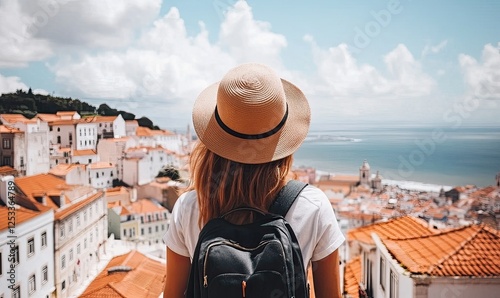 A female tourist takes in the stunning Lisbon skyline from a balcony, savoring travel, vacation, and tourism in Portugal