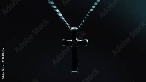 Close-up of a simple crucifix necklace against dark background. Possible use Religion, faith, spirituality stock photography