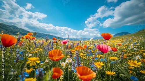 A wide-angle view of a vibrant floral landscape, featuring rolling hills covered with a mix of colorful wildflowers like poppies, daisies, and lavender, under a clear blue sky.