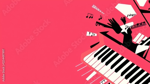 Pianist playing energetic music, pink background, musical notes flying, concert poster design