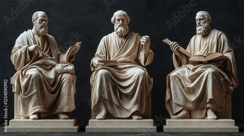 Three Ancient Philosophers Seated with Books in Marble Sculpture Against a Dark Background