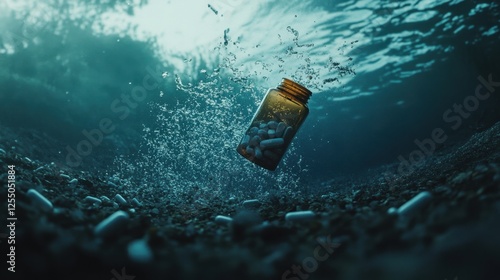 A prescription bottle tumbling in water, pills escaping in slow motion, creating a poetic and surreal composition.