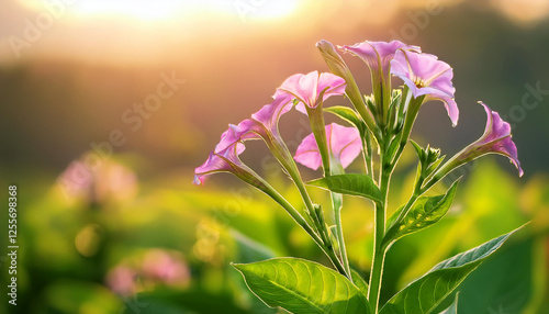 nicotiana rustica or aztec tobacco flower plant with inexperienced blurred historical past in sun light
