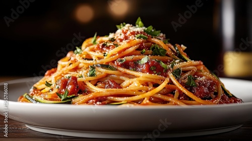 A mouthwatering plate of spaghetti enveloped in rich tomato sauce, garnished with fresh herbs, showcasing a traditional Italian comfort food experience.