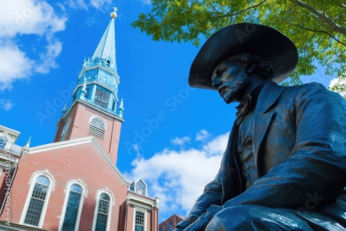Historic Old North Church with Paul Revere Statue: A Blue Sky Backdrop of Boston's Architectural Charm