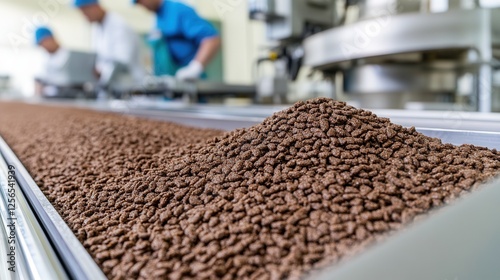 #1256541939Dry pet food kibble moves along conveyor belt, in a pet food factory processing line.